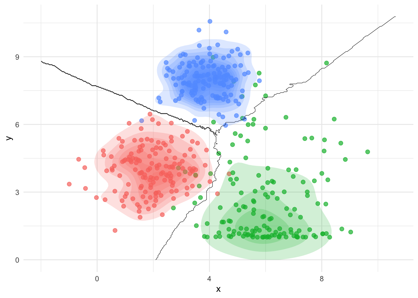 library(ggplot2)library(MASS)library(class) # Für k-NN Klassifikation# Synthetische Daten erzeugenset.seed(42)n <-150group1 <-data.frame(x =rnorm(n, mean =2, sd =1), y =rnorm(n, mean =4, sd =1), group ="A")group2 <-data.frame(x =rnorm(n, mean =6, sd =1.5), y =sin(rnorm(n, mean =5, sd =1)) *4+5, group ="B")group3 <-data.frame(x =rnorm(n, mean =4, sd =0.8), y =rnorm(n, mean =8, sd =0.8), group ="C")# Daten kombinierendata <-rbind(group1, group2, group3)# Raster für Entscheidungsgrenzengrid <-expand.grid(x =seq(min(data$x) -1, max(data$x) +1, length =300),y =seq(min(data$y) -1, max(data$y) +1, length =300))# k-NN Klassifikation für nicht-lineare Grenzenknn_pred <-knn(train = data[, 1:2], test = grid, cl = data$group, k =15)grid$pred <- knn_pred# Plotggplot(data, aes(x = x, y = y, color = group)) +geom_point(size =2, alpha =0.7) +# Punktegeom_contour(data = grid, aes(z =as.numeric(pred)), breaks =c(1.5, 2.5), color ="black", linewidth =0.2, linetype ="solid") +# Wilde Grenzenstat_density_2d(aes(fill = group), geom ="polygon", alpha =0.2, color =NA) +# Farbige Dichtekonturentheme_minimal() +theme(legend.position ="none")