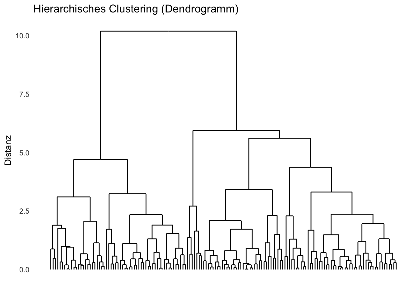 library(ggdendro)n <-50# Synthetische Daten erzeugendata_hclust <-data.frame(x =c(rnorm(n, mean =1), rnorm(n, mean =5), rnorm(n, mean =3)),y =c(rnorm(n, mean =2), rnorm(n, mean =6), rnorm(n, mean =4)))# Hierarchisches Clusteringdist_matrix <-dist(data_hclust)hclust_result <-hclust(dist_matrix)# Dendrogramm-Daten für ggplotdend_data <-dendro_data(hclust_result, type ="rectangle")# Plot für das Dendrogrammggplot() +geom_segment(data = dend_data$segments, aes(x = x, y = y, xend = xend, yend = yend), color ="black") +theme_minimal() +labs(title ="Hierarchisches Clustering (Dendrogramm)",x ="", y ="Distanz") +theme(axis.text.x =element_blank(),axis.ticks.x =element_blank(),panel.grid =element_blank())