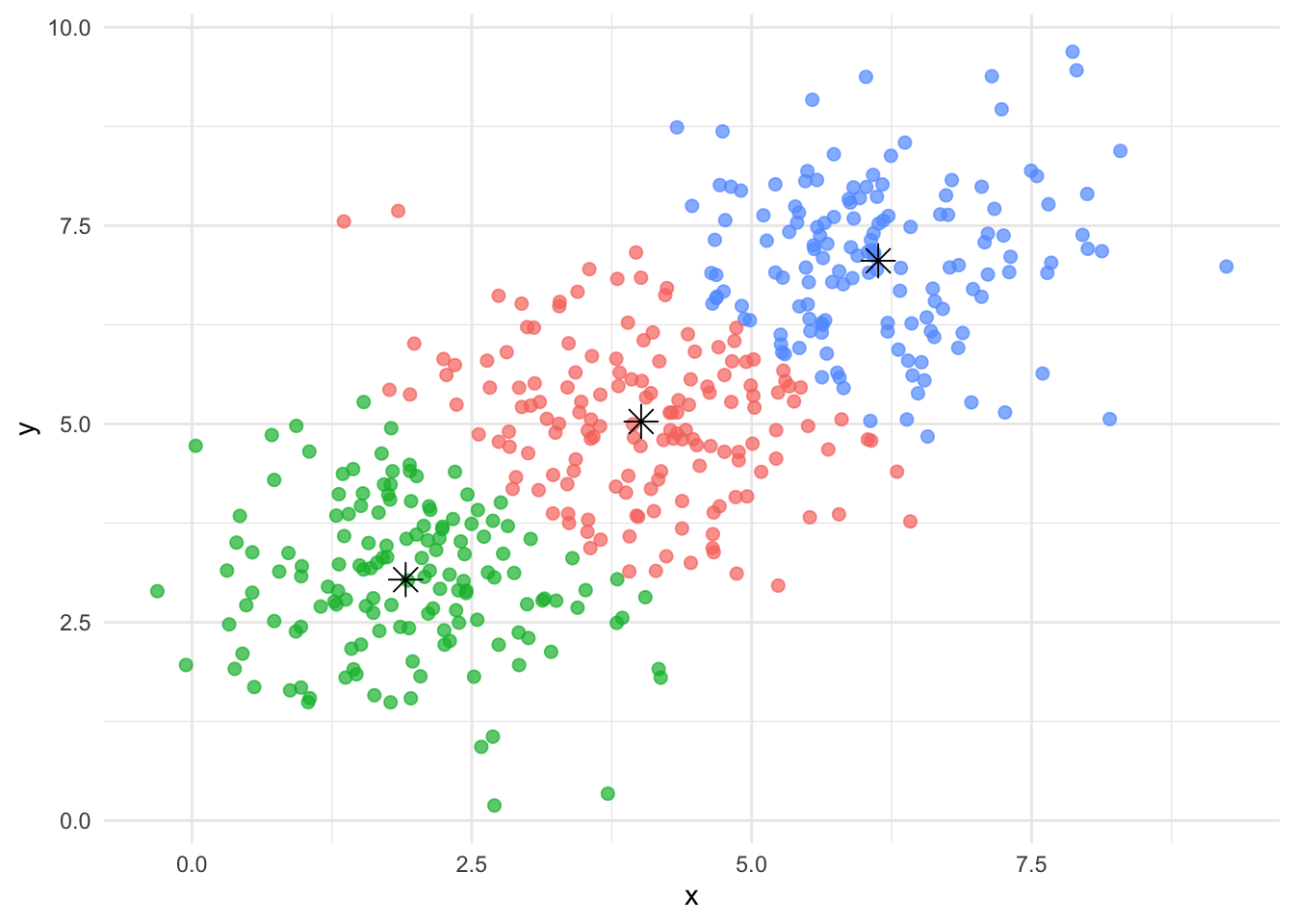 library(ggplot2)# Synthetische Daten erzeugenset.seed(123)n <-150data_kmeans <-data.frame(x =c(rnorm(n, mean =2), rnorm(n, mean =6), rnorm(n, mean =4)),y =c(rnorm(n, mean =3), rnorm(n, mean =7), rnorm(n, mean =5)))# K-Means Clusteringkmeans_result <-kmeans(data_kmeans, centers =3)data_kmeans$cluster <-as.factor(kmeans_result$cluster)# Plot für K-Means Clusteringggplot(data_kmeans, aes(x = x, y = y, color = cluster)) +geom_point(size =2, alpha =0.7) +geom_point(data =as.data.frame(kmeans_result$centers), aes(x = x, y = y), color ="black", size =4, shape =8) +# Zentren als Sternetheme_minimal() +theme(legend.position ="none")