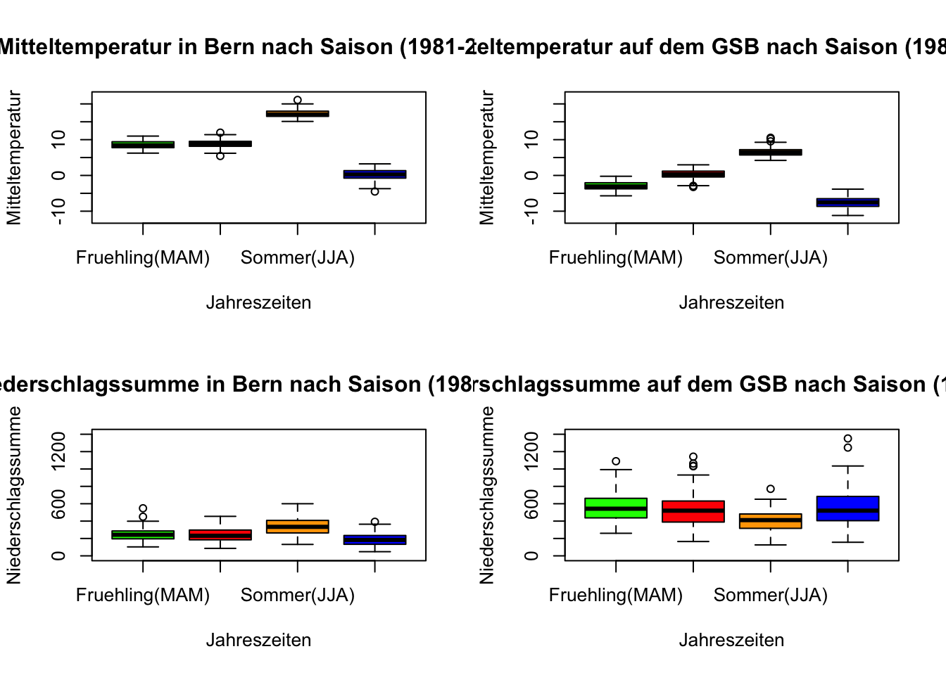 zeit <- saison[saison[,1] >= 1981 & saison[,1] <= 2010, ]- Stellt die Temperatur- und Niederschlagsverteilungen der Saisons in Genf und Gr. S. Bernhard für diesen Zeitraum in vier