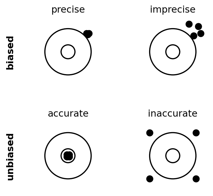 draw_target(axs[0, 0], points_precise_biased, "precise", label_y="biased")