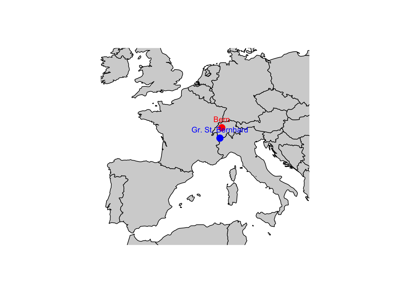 gross_bernhard_coords <- c(7.1761, 45.8689)- Versucht eine Europakarte herzustellen und Bern und Gr. Bernhard als Punkte auf die Karte zu plotten und die Punkte mit Stationsnamen zu versehen