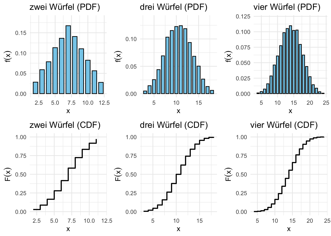 library(ggplot2)library(dplyr)library(gridExtra)# Funktion zum Berechnen der Wahrscheinlichkeits- und Verteilungsfunktionensimulate_dice <-function(n_dice) { rolls <-replicate(10000, sum(sample(1:6, n_dice, replace =TRUE))) # Simulation von n_dice Würfeln df <-as.data.frame(table(rolls) /length(rolls)) %>%rename(x = rolls, probability = Freq) %>%mutate(x =as.numeric(as.character(x))) %>%arrange(x) %>%mutate(cumulative_probability =cumsum(probability))return(df)}# Daten für 2, 3 und 4 Würfeldf_2dice <-simulate_dice(2)df_3dice <-simulate_dice(3)df_4dice <-simulate_dice(4)# Plots für die PDF und CDF von 2 Würfelnplot_pdf_2 <-ggplot(df_2dice, aes(x = x, y = probability)) +geom_bar(stat ="identity", fill ="skyblue", color ="black", width =0.7) +labs(title ="zwei Würfel (PDF)", x ="x", y =expression(f(x))) +theme_minimal() +ylim(0, max(df_2dice$probability, na.rm =TRUE) *1.1)plot_cdf_2 <-ggplot(df_2dice, aes(x = x, y = cumulative_probability)) +geom_step(linewidth =0.8, color ="black") +labs(title ="zwei Würfel (CDF)", x ="x", y =expression(F(x))) +theme_minimal() +ylim(0, 1)# Plots für die PDF und CDF von 3 Würfelnplot_pdf_3 <-ggplot(df_3dice, aes(x = x, y = probability)) +geom_bar(stat ="identity", fill ="skyblue", color ="black", width =0.7) +labs(title ="drei Würfel (PDF)", x ="x", y =expression(f(x))) +theme_minimal() +ylim(0, max(df_3dice$probability, na.rm =TRUE) *1.1)plot_cdf_3 <-ggplot(df_3dice, aes(x = x, y = cumulative_probability)) +geom_step(linewidth =0.8, color ="black") +labs(title ="drei Würfel (CDF)", x ="x", y =expression(F(x))) +theme_minimal() +ylim(0, 1)# Plots für die PDF und CDF von 4 Würfelnplot_pdf_4 <-ggplot(df_4dice, aes(x = x, y = probability)) +geom_bar(stat ="identity", fill ="skyblue", color ="black", width =0.7) +labs(title ="vier Würfel (PDF)", x ="x", y =expression(f(x))) +theme_minimal() +ylim(0, max(df_4dice$probability, na.rm =TRUE) *1.1)plot_cdf_4 <-ggplot(df_4dice, aes(x = x, y = cumulative_probability)) +geom_step(linewidth =0.8, color ="black") +labs(title ="vier Würfel (CDF)", x ="x", y =expression(F(x))) +theme_minimal() +ylim(0, 1)# Anordnung der Plots in einem 3x2-Layoutgrid.arrange(plot_pdf_2, plot_pdf_3, plot_pdf_4, plot_cdf_2, plot_cdf_3, plot_cdf_4, ncol =3, nrow =2)