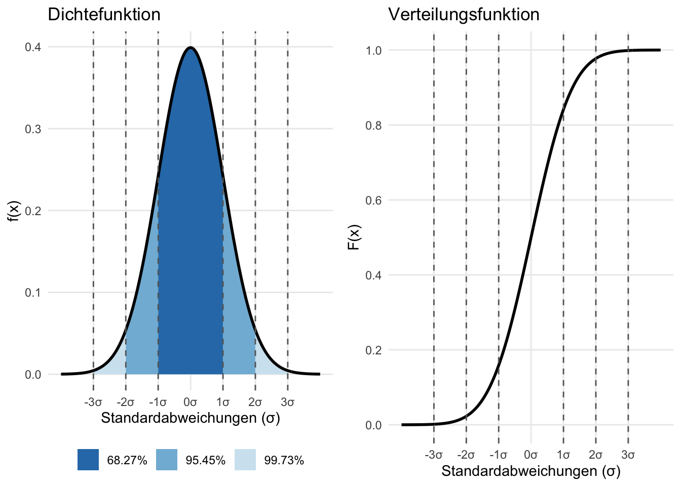 library(ggplot2)library(gridExtra)# Erzeugung der Normalverteilungx <-seq(-4, 4, length.out =1000)y_pdf <-dnorm(x, mean =0, sd =1)y_cdf <-pnorm(x, mean =0, sd =1)# Datensätze erstellendf_pdf <-data.frame(x = x, y = y_pdf)df_cdf <-data.frame(x = x, y = y_cdf)# PDF Plotplot_pdf <-ggplot(df_pdf, aes(x = x, y = y)) +geom_ribbon(data =subset(df_pdf, x >=-3& x <=3),aes(ymin =0, ymax = y, fill ="99.73%")) +geom_ribbon(data =subset(df_pdf, x >=-2& x <=2),aes(ymin =0, ymax = y, fill ="95.45%")) +geom_ribbon(data =subset(df_pdf, x >=-1& x <=1),aes(ymin =0, ymax = y, fill ="68.27%")) +geom_line(linewidth =1) +geom_vline(xintercept =c(-3, -2, -1, 1, 2, 3), linetype ="dashed", color ="gray40") +labs(x ="Standardabweichungen (σ)", y ="f(x)",title ="Dichtefunktion") +scale_x_continuous(breaks =-3:3,labels =paste0(c("-3", "-2", "-1", "0", "1", "2", "3"), "σ")) +scale_fill_manual(values =c("68.27%"="#2C7BB6","95.45%"="#81B9D9","99.73%"="#D1E5F0" )) +theme_minimal() +theme(panel.grid.minor =element_blank(),legend.position ="bottom",legend.title =element_blank() )# CDF Plotplot_cdf <-ggplot(df_cdf, aes(x = x, y = y)) +geom_line(linewidth =1) +geom_vline(xintercept =c(-3, -2, -1, 1, 2, 3), linetype ="dashed", color ="gray40") +labs(x ="Standardabweichungen (σ)", y ="F(x)",title ="Verteilungsfunktion") +scale_x_continuous(breaks =-3:3,labels =paste0(c("-3", "-2", "-1", "0", "1", "2", "3"), "σ")) +scale_y_continuous(breaks =seq(0, 1, 0.2)) +theme_minimal() +theme(panel.grid.minor =element_blank() )# Plots nebeneinander anordnengrid.arrange(plot_pdf, plot_cdf, ncol =2)