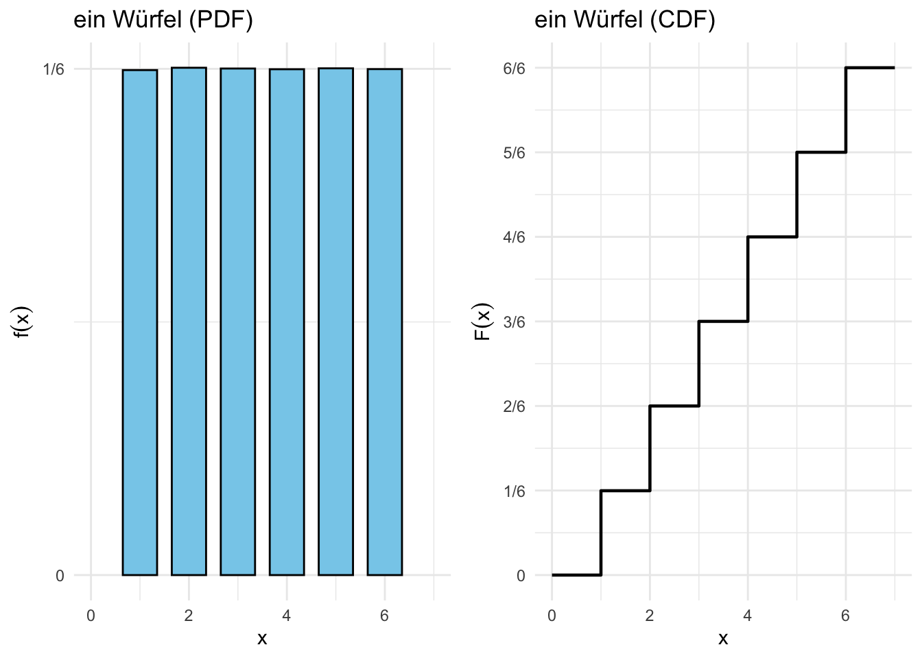library(ggplot2)library(dplyr)library(gridExtra)# Funktion zum Berechnen der Wahrscheinlichkeits- und Verteilungsfunktionensimulate_dice <-function(n_dice) { rolls <-replicate(1000000, sum(sample(1:6, n_dice, replace =TRUE))) # Simulation von n_dice Würfeln df <-as.data.frame(table(rolls) /length(rolls)) %>%rename(x = rolls, probability = Freq) %>%mutate(x =as.numeric(as.character(x))) %>%arrange(x) %>%mutate(cumulative_probability =cumsum(probability))# Zusätzliche Punkte für 0 und 1 df <-rbind(data.frame(x =0, probability =0, cumulative_probability =0), df,data.frame(x =max(df$x) +1, probability =0, cumulative_probability =1))return(df)}# Daten für 1 Würfeldf_1dice <-simulate_dice(1)# Plot für die Wahrscheinlichkeitsfunktion (PDF) von 1 Würfelplot_pdf_1 <-ggplot(df_1dice, aes(x = x, y = probability)) +geom_bar(stat ="identity", fill ="skyblue", color ="black", width =0.7) +labs(title ="ein Würfel (PDF)", x ="x", y =expression(f(x))) +theme_minimal() +ylim(0, max(df_1dice$probability, na.rm =TRUE) *1.1) +xlim(0, 7) +scale_y_continuous(breaks =seq(0, 1/6, by =1/6),labels =c("0", "1/6"))# Plot für die kumulative Verteilungsfunktion (CDF) von 1 Würfelplot_cdf_1 <-ggplot(df_1dice, aes(x = x, y = cumulative_probability)) +geom_step(linewidth =0.8, color ="black") +labs(title ="ein Würfel (CDF)", x ="x", y =expression(F(x))) +theme_minimal() +ylim(0, 1) +xlim(0, 7) +scale_y_continuous(breaks =seq(0, 1, by =1/6),labels =c("0", "1/6", "2/6", "3/6", "4/6", "5/6", "6/6"))# Anordnung der beiden Plots in einem 2x1-Layoutgrid.arrange(plot_pdf_1, plot_cdf_1, ncol =2)