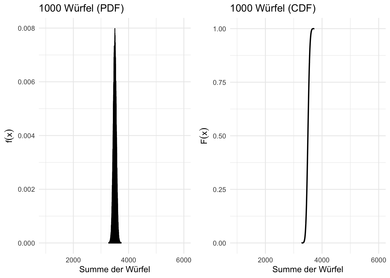 # Lade benötigte Paketelibrary(ggplot2)library(dplyr)library(gridExtra)# Parameter definierenn_dice <-1000# Anzahl Würfeln_simulations <-100000# Anzahl Simulationen# Dynamische xlim basierend auf minimaler/maximaler Würfelsummex_min <- n_dice *1# Minimale Summe (alle Würfel = 1)x_max <- n_dice *6# Maximale Summe (alle Würfel = 6)# Funktion zur Simulation der Würfelsummen und Berechnung der Wahrscheinlichkeitensimulate_dice <-function(n_dice, n_simulations) {# Simulation: Summe von n_dice Würfeln pro Durchlauf rolls <-replicate(n_simulations, sum(sample(1:6, n_dice, replace =TRUE)))# Häufigkeitstabelle mit Wahrscheinlichkeiten und kumulativen Wahrscheinlichkeiten df <-as.data.frame(table(rolls)) %>%rename(x = rolls, probability = Freq) %>%mutate(x =as.numeric(as.character(x)), # x als numerischprobability = probability /sum(probability), # Wahrscheinlichkeiten normierencumulative_probability =cumsum(probability) # Kumulative Verteilungsfunktion ) %>%arrange(x)return(df)}# Simulation durchführendf_results <-simulate_dice(n_dice, n_simulations)# Wahrscheinlichkeitsfunktion (PDF) plottenplot_pdf <-ggplot(df_results, aes(x = x, y = probability)) +geom_bar(stat ="identity", fill ="skyblue", color ="black", width =0.7) +labs(title =paste(n_dice, "Würfel (PDF)"),x ="Summe der Würfel",y =expression(f(x)) ) +theme_minimal() +# x-Achse dynamisch setzenxlim(c(x_min, x_max))# Kumulative Verteilungsfunktion (CDF) plottenplot_cdf <-ggplot(df_results, aes(x = x, y = cumulative_probability)) +geom_step(linewidth =0.8, color ="black") +labs(title =paste(n_dice, "Würfel (CDF)"),x ="Summe der Würfel",y =expression(F(x)) ) +theme_minimal() +ylim(0, 1) +# x-Achse dynamisch setzenxlim(c(x_min, x_max))# Beide Plots nebeneinander ausgebengrid.arrange(plot_pdf, plot_cdf, ncol =2)